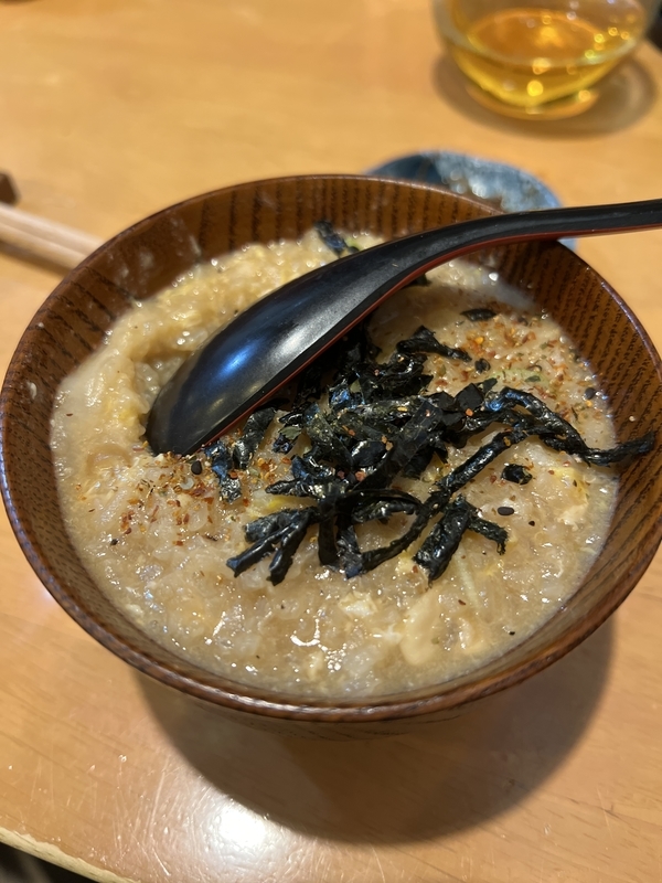 最後はおねーさんがちょっと手を加えて雑炊にしてくれました。小さなお餅なんかも入っていたりして、これも美味しかった。ごちそうさまでした。